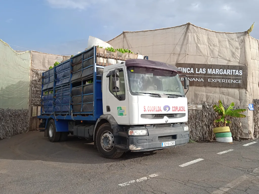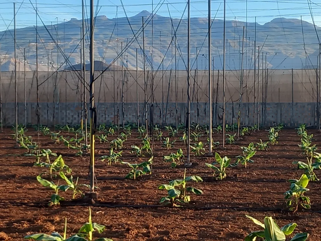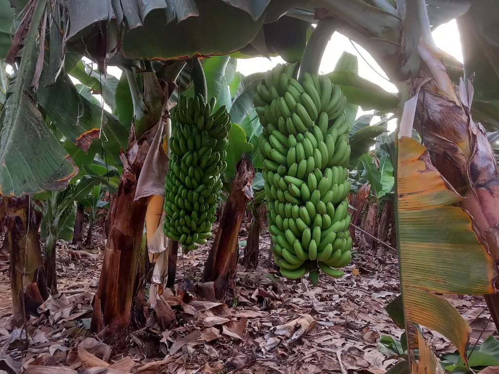 Auf dieser Finca werden 2 Arten der kanarischen Banane angebaut, die „grosse Zwergbanane“ und die „dicke Palme“ oder auch „kleine Zwergbanane“. Beiden stammen von der Dwarf Cavendish ab und erreichen ein Gewicht von 45 bis 50 kg pro Staude. Einige Stauden können sogar 70 kg erreichen. Die angebaute Fläche beträgt ungefähr 7 ha. Davon sind 98 % Bananen und 2% Mangos, Papayas und Avocados. Die aus Südostasien stammende Bananenpflanze Musa Acuminata mag zwar wie ein Baum aussehen gehört jedoch zu den krautigen Pflanzen.